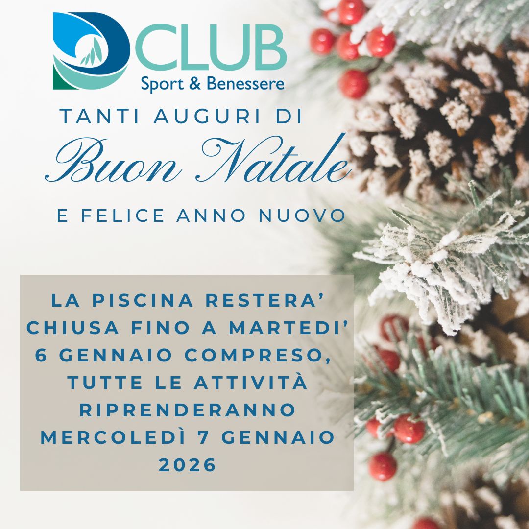 Ci prendiamo anche noi qualche giorno di riposo. La piscina resterà chiusa fino a Martedì 6 Gennaio compreso e tutte le attività riprenderanno da Mercoledì 7 Gennaio!