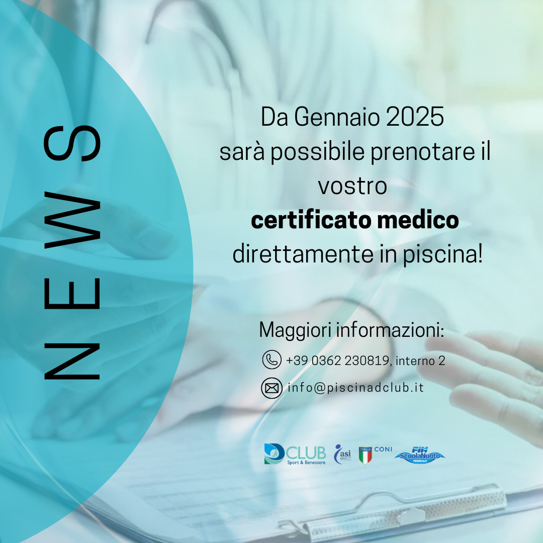 Da Gennaio 2025 sarà possibile prenotare la visita per il certificato medico direttamente in piscina!
