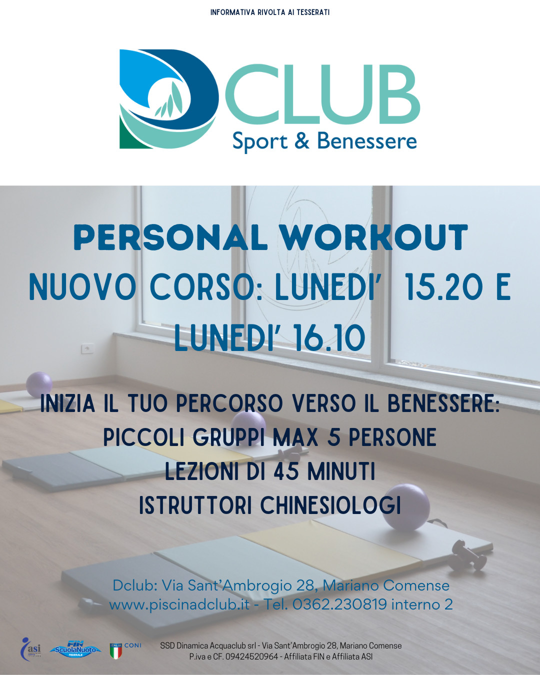 - Personal Workout: un’attività di ginnastica personalizzata, il lavoro proposto è personalizzato in base alle esigenze di ciascun iscritto