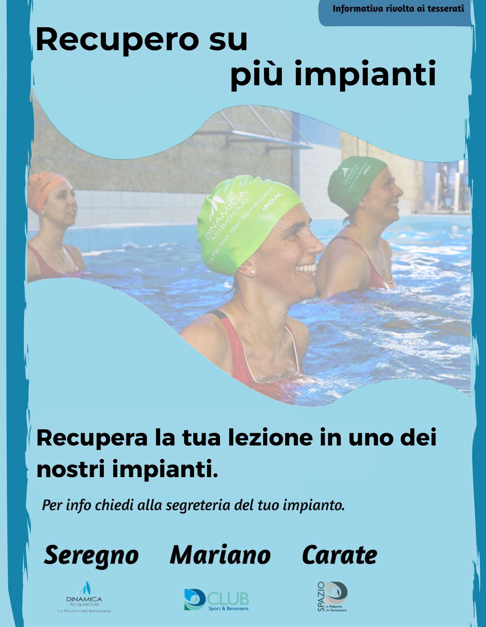 Da quest’anno puoi recuperare la lezione persa all’interno del nostro NETWORK!!! Quest’opportunità è valida per alcune tipologie di attività. Per usufruire di questo servizio rivolgiti alla segreteria del tuo impianto.