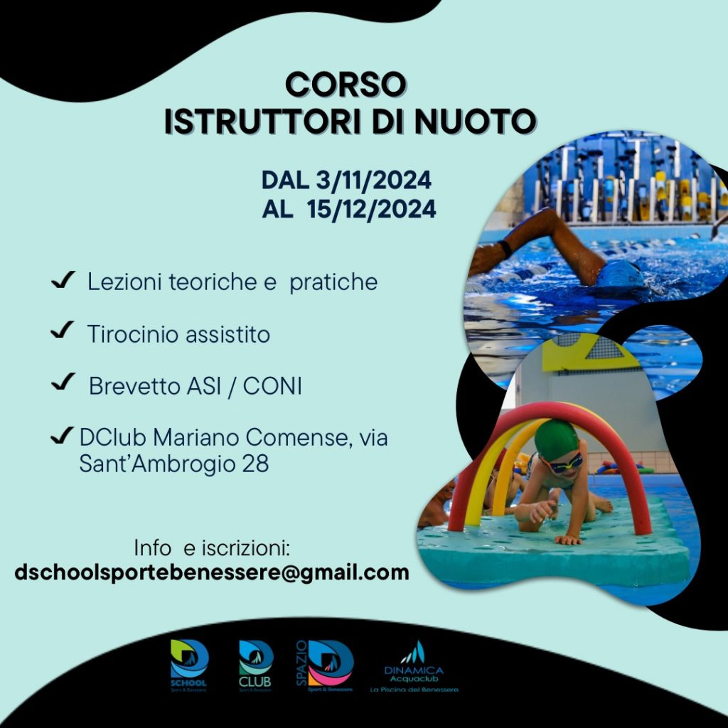 Da Novembre a Dicembre 2024 la Dschool Sport&benessere in collaborazione con Dinamica Acquaclub e Dclub organizza il corso di Formazione per diventare istruttore di Nuoto.