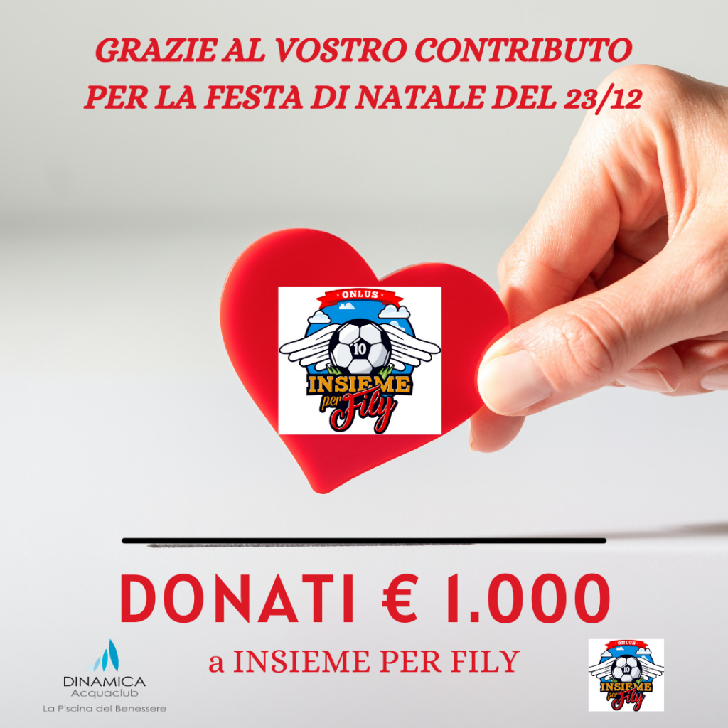 Anche quest’anno, grazie alla vostra partecipazione alla Festa di Natale e alle Donazioni dello Staff abbiamo raccolto e devoluto in beneficienza € 1.000.00 all’associazione “Insieme per Fily” che sostiene la ricerca contro l’osteosarcoma infantile e aiuta bimbi affetti da questa malattia e le loro famiglie!