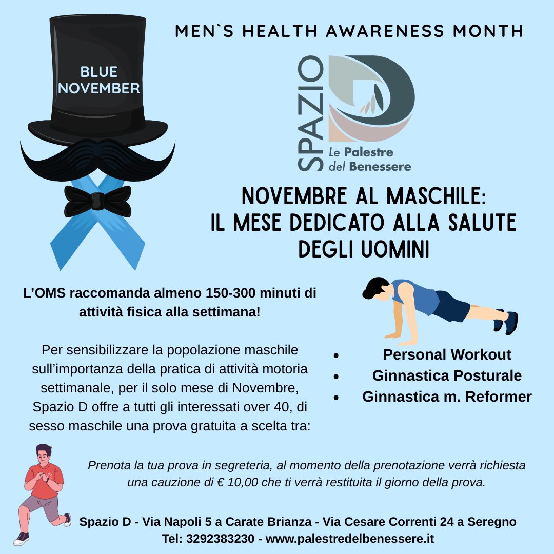 Novembre è il mese dedicato alla salute maschile. L’OMS consiglia, per mantenersi in salute, almeno 150/300 minuti di attività motoria la settimana!